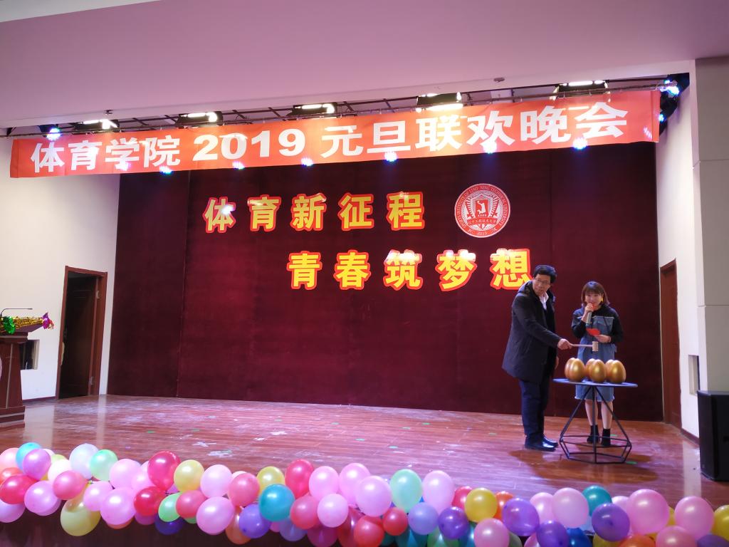 晚会伊始,韩雪峰书记首先致辞,他对全体师生在2018年所做的工作与努力给予了充分肯定并送上了新年的美好祝福。本台晚会以“体育新征程 青春筑梦想”为主题,节目精彩纷呈。学生乐队的吉他弹唱拉开了晚会的帷幕,精彩有趣的游戏将同学们的积极性调动起来,之后的“砸金蛋”环节更是将晚会掀起一个又一个高潮。