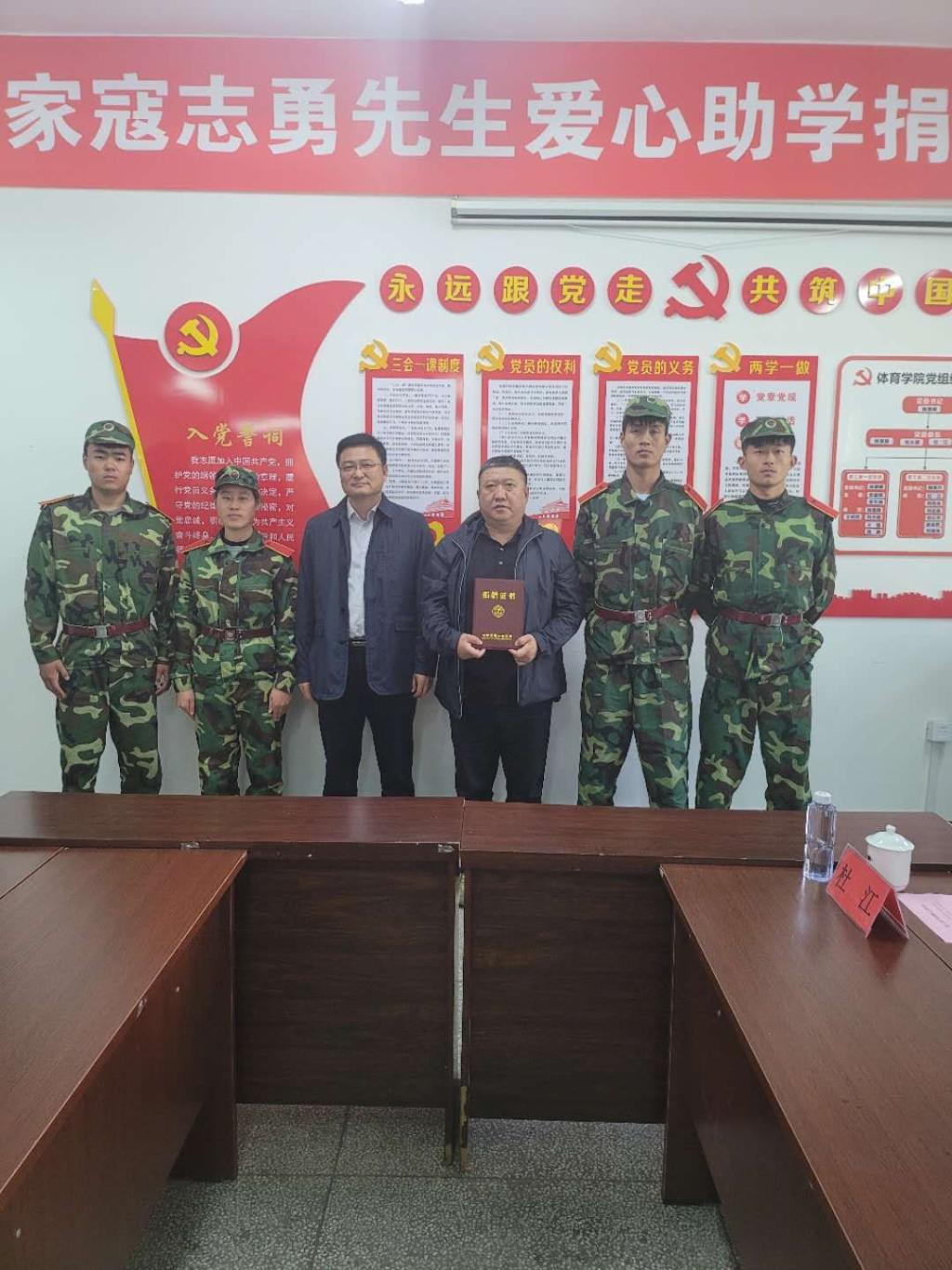运动训练专业2020级4名受捐赠学生颁发助学金。接下来,马修泉副校长为寇志勇先生颁发捐赠证书。在接下来的交流座谈中,4名学生分别介绍了自己的基本情况,他们表示,一定会铭记寇志勇先生的关怀和帮助,立志要在大学四年的时间里发展进步,以友谊的成绩回报社会。寇志勇先生在讲话中对受捐赠的4位同学提出了殷切希望,要利用好自身运动训练专业的特长,好好学习,不断进取,努力成长为优秀的人才,为体育事业贡献更多力量。副校长马修泉强调,受捐赠同学应常怀感恩之心,树立崇高理想,坚持不懈奋斗,努力成长为具有过硬本领的新时代人才。
