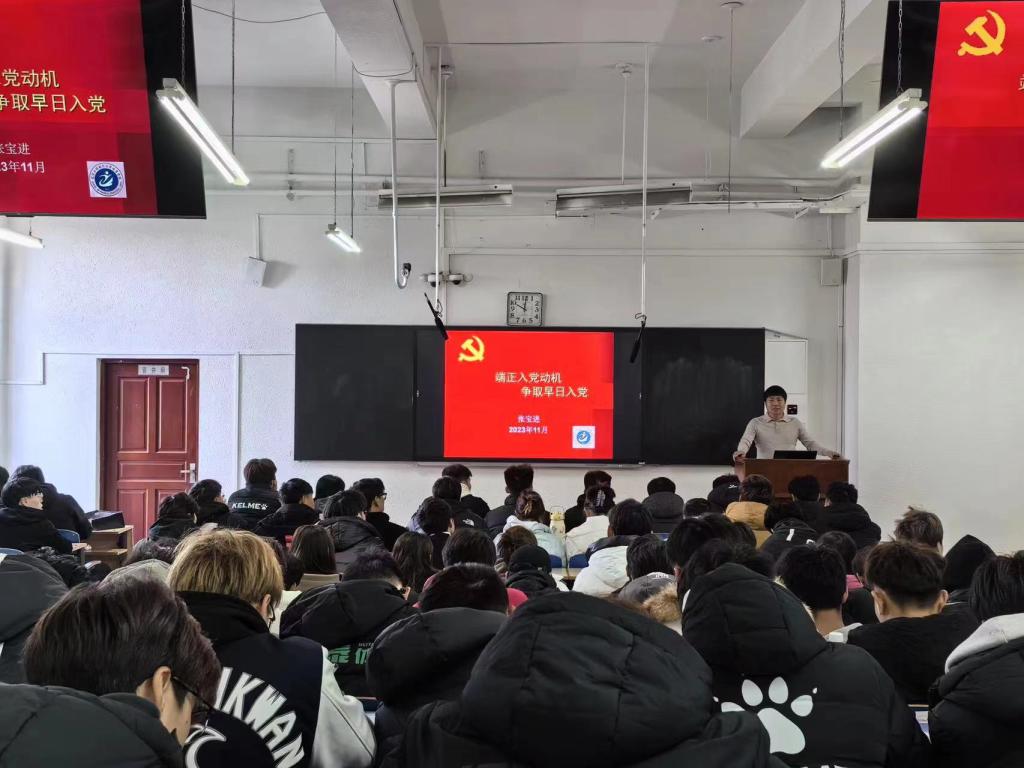 张宝进老师以《端正入党动机 争取早日入党》为题,从为什么要端正入党动机和怎样端正入党动机两个方面入手,让学生明确只有端正入党动机,才能产生正确的争取入党的行动。他以排雷英雄杜富国、全国道德模范张桂梅等先进人物的事迹鼓舞学生,要具备强烈的爱国情怀、坚定的理想信念、舍己忘我的奉献精神和持之以恒的意志品质,用奋斗的青春书写人生光辉的篇章。