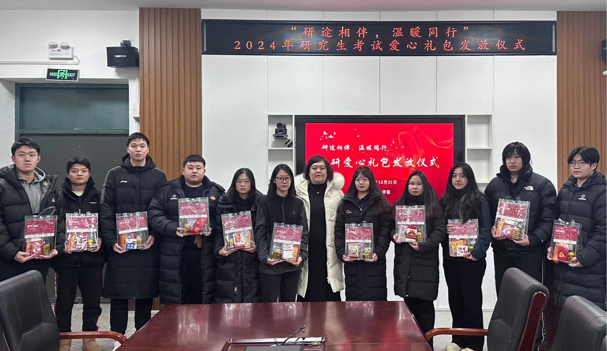 在学院二楼会议室举办“研途相伴,温暖同行”2024年研究生考试爱心礼包发放仪式,为即将踏入考场的12名学子送上考研暖心礼包,帮助考研学子缓解备考压力、增强备考信心、激发考试动力。仪式由院团委书记张一兵主持,院党委副书记李叙瑶出席。