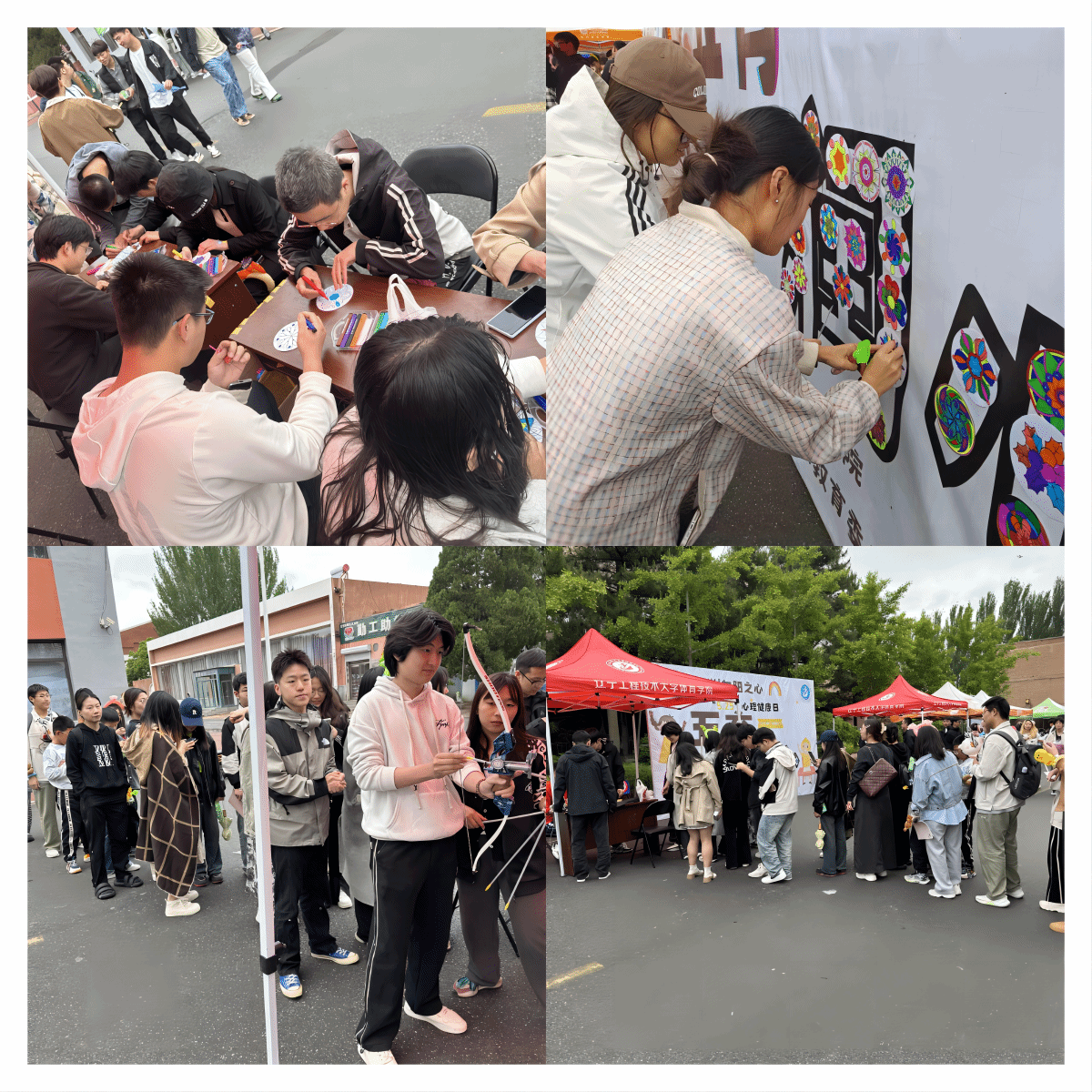 活动现场共设置美育、劳育、体育和智育四个项目。亲手绘制曼陀罗色卡,通过色彩和图形释放无意识深处压抑的情感,起到缓解焦虑、解压的效果;将色卡制成DIY手稿,促进学生手脑结合、身心和谐发展;亲身体验射箭运动,使人产生愉悦的心情,进而缓解心理压力,消除负面情绪,增强心理稳定性;认真填写调查问卷,了解学生心理健康状况、需求和问题,为后续针对性的心理健康教育提供数据支撑。活动项目广受同学们好评,参与热情十分高涨。