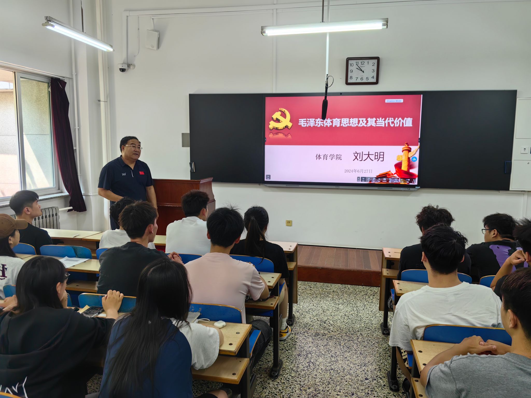 刘大明院长以《毛泽东体育思想及其当代价值》为题,围绕毛泽东体育思想的形成基础和发展历程,细致阐述了毛泽东体育思想的内涵、基本内容、主要特征、历史意义和当代价值。在课程中,刘院长运用运动训练学项群训练理论和专项训练理论生动阐释了体育运动与体力劳动的区别,教育引导学生要将毛泽东体育思想融入日常学习和训练中,提升体能、技术能力、战术能力、心理能力以及知识能力,创造更为优异的成绩,在手球、篮球、足球和田径等国内重要赛事中,为学校争光添彩。