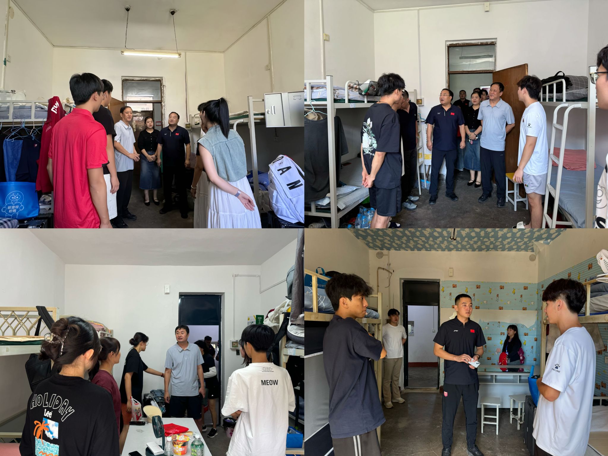 8月31日中午,院党委书记田中雨、院长刘大明、党委副书记李叙瑶、辅导员及新生班级班导师来到学生宿舍走访。刘大明院长代表学院向新同学们的到来表示热烈欢迎,亲切问询他们初入校园的感受与生活适应状态,并希望他们能够以新时代体育青年的饱满状态,尽快适应并融入大学的学习生活。5位新生班级班导师也通过班会形式与同学们就进入大学后的学习、发展、生活等问题进行了亲切交流,帮助新生尽快开启大学新的篇章。