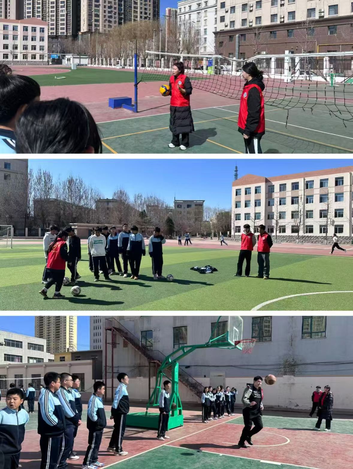 在运动场上,志愿者们将班级编排成篮球、足球、排球三个专项小组,分别开展专项培训及模拟训练环节。从运动的各个环节都配以生动的讲解和动作示范,让学生们在轻松愉快的氛围内掌握了动作的关键点,并耐心细致地帮助每一位同学改进动作、提升技能。