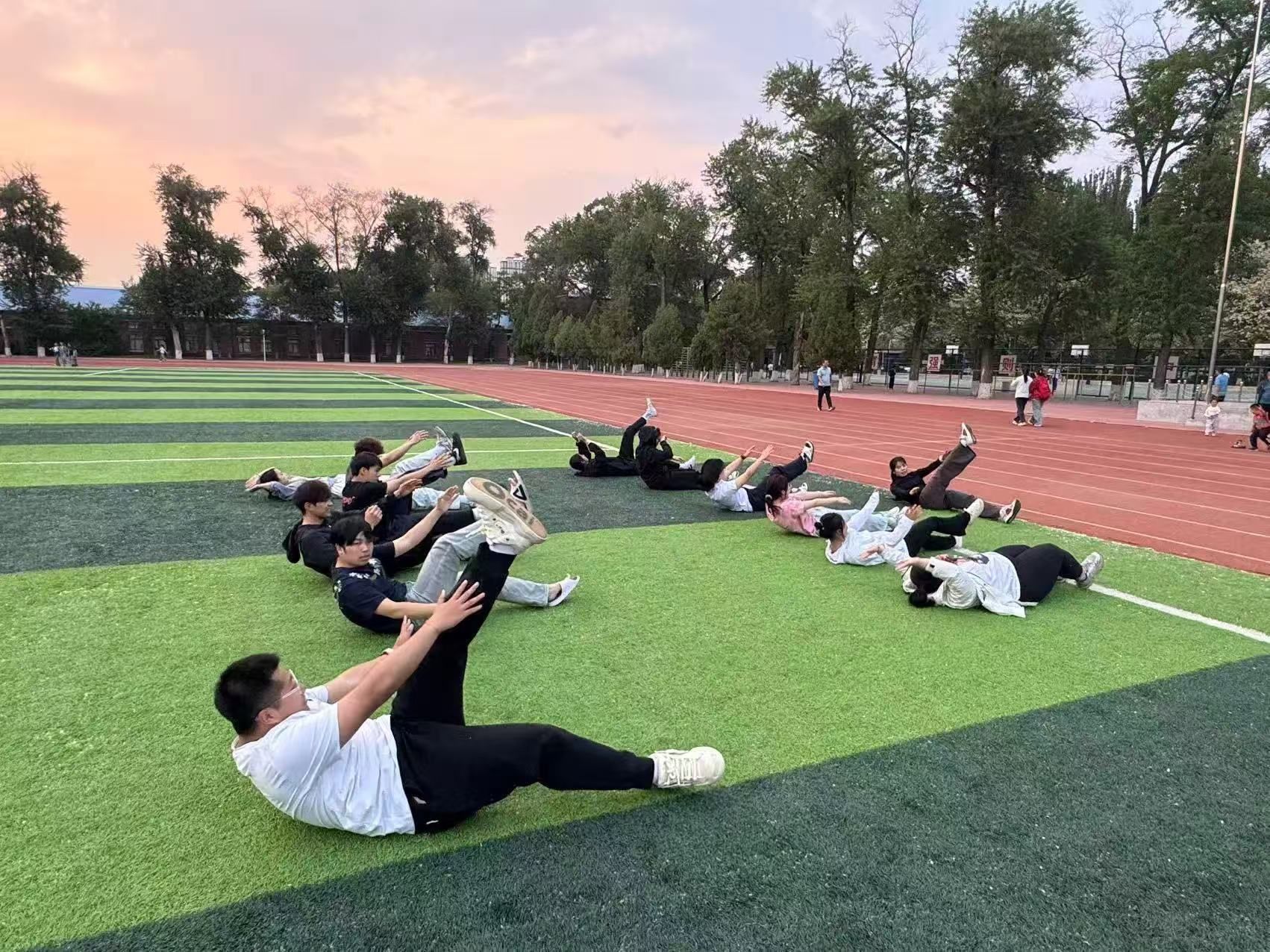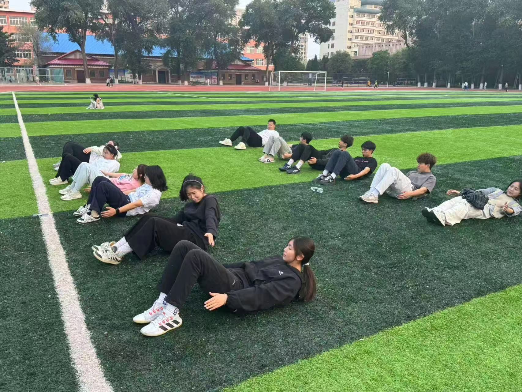 八段锦活动结束后,志愿者们组织开展了核心训练,包含平板支撑、仰卧卷腹、俄罗斯转体等动作。通过针对性练习增强腰腹力量、提升身体稳定性,衔接前期BMI测试与身体激活训练,进一步强化健康训练效果,助力参与者构建更均衡的身体素质。
