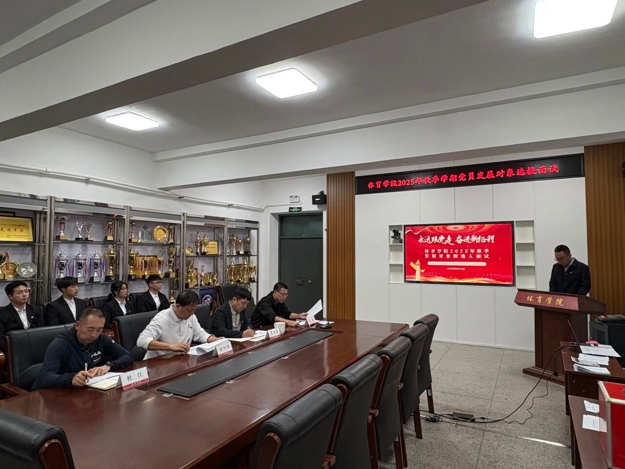 在学院会议室举办了2025年秋季学期党员发展对象选拔面试。院党委书记田中雨、正处级组织员张宝进、副院长杜江、副院长王雷担任评委,面试由院学生党支部书记郑重主持。