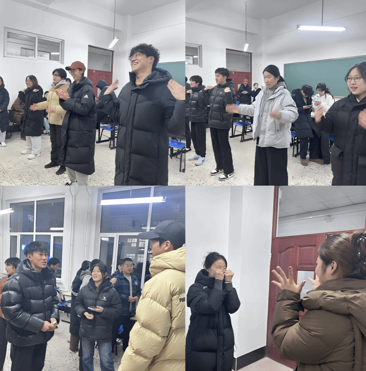 本次活动以“情绪盲盒”展开,参与者们随机分为4组,各组同台竞技,随机抽取的词语让游戏充满未知惊喜。有人用肢体演绎“怒怼”的滑稽,也有人靠眼神传递“心有灵犀”的暗号。从卡顿的急中生智到秒猜的雀跃欢呼,随机词汇让每一轮都充满新鲜感,逐渐打破了各小组的陌生感。第二个项目“天气预报”。从“小雨”轻拍肩膀,到“狂风暴雨”跺脚蹦跳,节奏越催越快,有人手忙脚乱并偷看,有人笑到蹲在地上,简单的动作配合,让拘谨彻底消失,教室充满欢声笑语。第三个项目“两真一假”。大家分享“跑过马拉松”“不玩端游”等故事,猜真假的过程中,才发现身边同学藏着不少“隐藏技能”,陌生的彼此在趣味问答里慢慢熟悉,默契悄然升温。