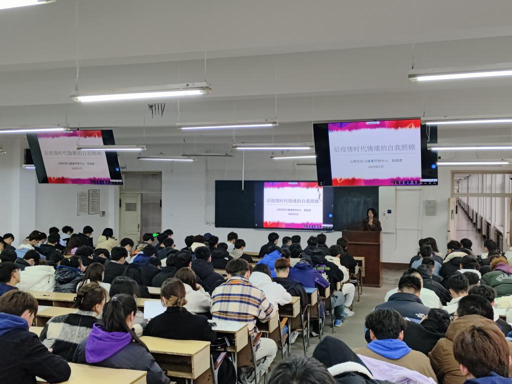 在新华楼202开展开学第一课——“后疫情时代情绪的自我照顾”心理健康教育专题讲座,邀请校心理发展与健康管理中心陈晓蕾副教授为主讲人。讲座由院团委书记李叙瑶主持。